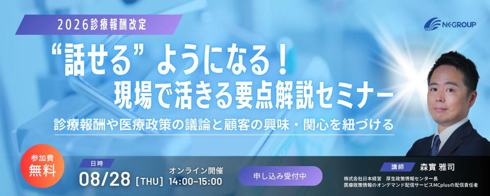 内容 | 診療報酬改定や医療政策は、多くの場合、社内の一部の方のみが理解しており、その知見を現場の担当者まで共有・浸透させるのは容易ではありません。 本セミナーでは、制度や政策に関する難解な知識を学ぶことが目的ではなく、病院の経営層や幹部層と向き合う場面で、診療報酬改定や医療政策をテーマにどのようなトークをすればよいか、そのために押さえておくべき基礎を確認していきます。 ・前回(2024年度)診療報酬改定のおさらい ・診療報酬改定に影響を与える政策(骨太方針、新たな地域医療構想、医師偏在対策、かかりつけ医機能報告制度、医療DX)のポイント ・営業現場で持つべき視点と実務に活かせるポイント アーカイブ配信あり |