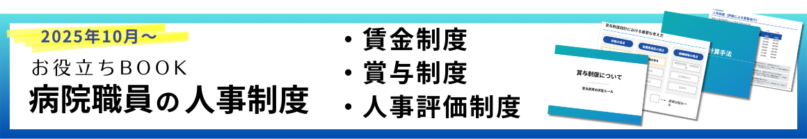 | 内容 | 本お役立ち資料で整理できること 本資料では、病院の人事制度を構成する主要な要素について、6つの資料を通じて体系的に整理しています。人事制度を「作る側・運用する側」の立場で理解するための基本的な考え方に焦点を当てています。 ■ 賃金制度について 賃金制度の基本的な仕組みや、評価との関係性について解説しています。給与や昇給がどのような考え方で決まっているのかを整理し、制度を説明・運用する際の基礎知識として活用できます。 ■ 賞与制度について 賞与原資の決定ルールと配分ルールの2つの視点から、賞与制度の考え方を整理しています。病院の経営状況と人事評価をどのように結びつけて判断するのかを考えるための資料です。 ■ 人事評価制度について 人事評価制度の構成や設計の考え方、評価表の使い方、評価が行われる流れについて整理しています。評価をどのような目的で行い、組織運営にどう生かしていくのかを理解するための資料です。 これら6つの資料を通じて、人事評価・賃金・賞与を一連の人事制度として整理して理解することができます。 人事制度を見直す際の整理材料としてはもちろん、職員への説明や院内での共有を行う際の基礎資料としてもご活用いただけます。 以下の資料を、まとめて無料でダウンロードいただけます。 ・賃金制度に関する基本情報① ・賃金制度に関する基本情報② ・賞与原資の決定ルール ・賞与原資の配分ルール ・人事評価制度の構成と設計 ・人事評価表の使い方と流れ |