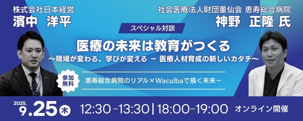 本セミナーは、第一線でご活躍されている恵寿総合病院 理事長補佐 神野正隆様と、Waculba創設者の濱中によるスペシャル対談の形式で、より深い視点から医療教育に対するお二人のお考えを掘り下げてご紹介します。
