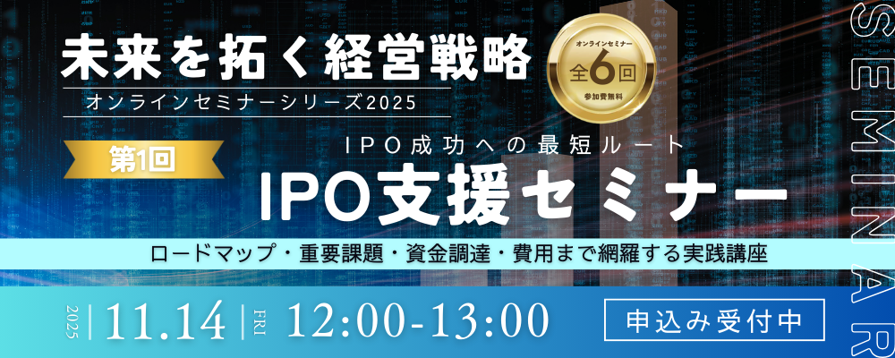 | 内容 | はじめに:なぜ今、IPOを学ぶのか? ・IPOの意義と目的:会社を次のステージへ(メリット) ・経営者が覚悟すべきこと:メリットの裏にある責任:デメリット ・本セミナーのゴールと全体像 第1部:IPO準備の全体像とロードマップ ・どの市場を目指すか?市場区分の特徴とトレンド ・IPO達成までの標準スケジュールと主要タスク ・成功の鍵を握るパートナーの役割と選定 第2部:上場審査で問われる「4つの重要課題」と対策 ・課題1:コーポレート・ガバナンス体制の構築 ・課題2:内部統制(J-SOX)の整備・運用 ・課題3:上場に耐えうる管理体制の構築 ・課題4:資金調達と資本政策の設計 第3部:IPO準備段階の資金調達戦略 ・なぜIPO「前」の資金調達が重要なのか? ・主な資金調達の方法 ・資金調達のフェーズ別戦略 第4部:IPO準備と維持にかかる費用 ・ IPO準備費用のモデルケース、上場後に継続的に発生する費用 ・費用対効果の考え方 まとめとネクストステップ ・IPO準備でよくある失敗例と対策 ・本日のまとめと、明日から始めるべきこと |