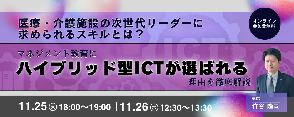 | 内容 | 次世代リーダーに求められる必須スキルとは ― 医療現場で必要とされるマネジメント力の最新動向 ハイブリッド型ICT教育の特徴と導入メリット ― 知識獲得と行動変容 これからの病院における人材育成戦略 ― 効果的なマネジメント教育の実践ポイント 後日、アーカイブ配信を予定しております。 |