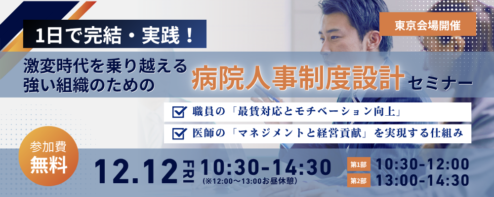 | 内容 | 【第1部】医師以外の職種の人事制度設計:賃上げ時代に職員のモチベーションを最大化する仕組みづくり ① 組織マネジメントとガバナンス ■ 理想の組織づくりのためのフレームワーク ■ 人事制度(等級・教育・評価・賃金)の全体像 ② 人事制度設計の論点 ■ 役職ごとの役割・責任を等級制度で明文化する ■ 昇進・昇格の見極めとガバナンス ■ 役割が変われば教育が必要、等級制度から教育体系を整備する ■ 役割遂行を振り返る、長所伸長・課題是正のための評価制度 ■ なぜかやられていない、人事評価を使った効果的な人材育成法 ③ 賃金制度設計とモチベーション向上 ■ あなたの病院は大丈夫? 賃金制度のリスクチェックと最低賃金アップへの対応 ■ コスト増を避け、職員の意欲を引き出す 担っている役割・責任・仕事に応じたシンプルな給与制度設計 ■ 賃上げをチャンスに! 職員のモチベーション向上に繋げる、評価と連動した賃金設計の具体的手法 【第2部】医師の人事制度設計:病院規模に応じた医師マネジメントシステムの導入と運用のポイント ① なぜ医師マネジメントが必要なのか ~病院を取り巻く環境~ ② 規模別の医師マネジメントに関する課題と求められること ■ 中小規模病院での医師マネジメントのポイント ■ 大規模病院での医師マネジメントのポイント ③ 医師の貢献度を定性的に評価する際のポイント ■ 評価項目・評価段階の設計ポイント ■ 多職種からの多面的な評価を実現する方法とは ④ 医師の貢献度を定量的に評価する際のポイント ■ 稼働率に応じて決まる、最も重要な病院共通項目とは ■ 業績に直結する診療科別目標の設計方法とは ■ 目標値の妥当性を担保する「内的妥当性」と「外的妥当性」とは ⑤ 医師の貢献度に合わせて処遇反映のポイント ■ 医師確保を後押しする複線型人事制度とは ■ 処遇反映方法と原資のつくり方とは ⑥ 医師マネジメントシステム導入における好事例 本セミナーは、午前・午後の2部構成となっており、お昼の休憩時間には「ランチ名刺交換会」を予定しております。お昼ご飯は弊社がお弁当をご用意いたします。なお、セミナーは午前・午後どちらかのみの参加でも問題ございません。 貴院の課題やご関心に応じて、必要なプログラムにご参加ください。 |