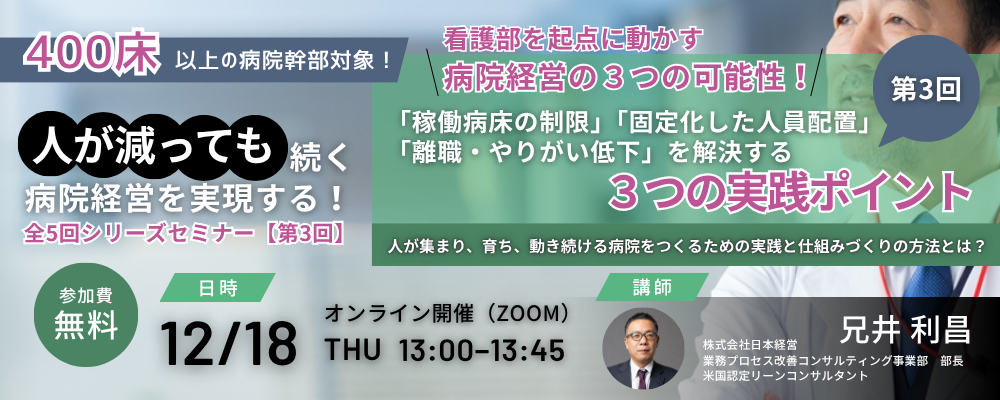 | 内容 | 第1部|病院経営を止める構造課題の正体 ① 病床はあるのに受け入れられない ・看護部繁忙=安全確保の限界=実質的な稼働制限 ② 7対1から10対1転換でも人件費が減らない ・業務構造が変わらず“減らせない体制”のまま ③ 採用難 × 定着しない × 離職が進む現場 ④ 「揃わない・揃っても動けない」病院の構造リスク 第2部|看護部を起点に動かす3つの可能性 ① 稼働病床を増やす ・「受け入れられない病棟」を「動く病棟」へ ・ 看護部が動けば病棟が動き、病院が動く ② 人員配置を再構築する ・ 業務改善→余力創出→自然退職+採用抑制 ・ 穏やかに人件費を最適化し、現場の余裕も確保 ③ 利益を未来へ再投資する ・ DX(記録支援/可視化/AI)、 人材育成(リーダー育成)、 地域連携(退院調整・情報連携) ・ 利益が生まれ→活かされ→再び利益が生まれる循環へ 第3部|動く病院をつくる8ヶ月実行モデル ① スタートは病棟の日常改善から ・まず「余力」をつくる ② 8ヶ月ロードマップ ・ 準備期:現地現物と業務の可視化 VSM/ムダ分析で看護業務を見える化し、改善ポイントを設定する。 ・ 実践期:短サイクル改善と標準化 2週間PDCAと可視化・キャッチボールで現場を動かし、 成果を標準化しつつ横展開へつなぐ。 ・ 定着期:成果共有と再投資設計 ・改善文化の定着 ・現場・師長・経営層が役割を持つ仕組み ・「やらされる改善」から「動くチーム」へ |
