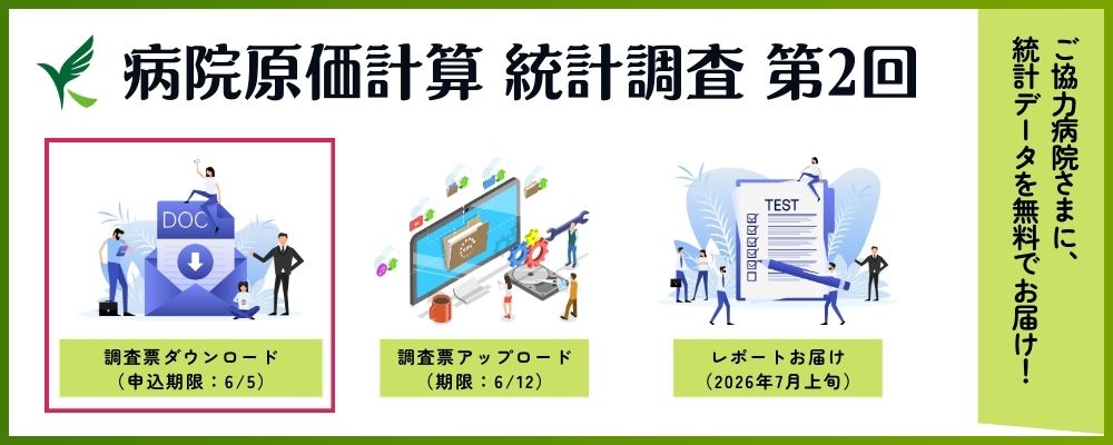 | 内容 | ■スケジュール ▷①参加申し込み:6月5日まで(延長しました) ・調査票をダウンロードしてください。DPCデータアップロード方法はご案内します ②データ提出:6月12日まで ・①の調査票を「専用フォーム」からアップロードください。 ・DPCデータについては、ご案内の別システムからアップロードください ③統計結果報告:2026年7月上旬(ご提出いただいたメールアドレス宛に送信します) ■本調査では、下記のような統計情報をお届けする予定です。 ・診療科別 医師一人当たり患者数及び売上 ・診療科別 医師人件費率 ・部門別 看護師人件費率 ・各病棟 1床当たり固定費 ※登録の手順につきましては「原価計算調査_解説動画」をご参考にしていただけると幸いです。 |