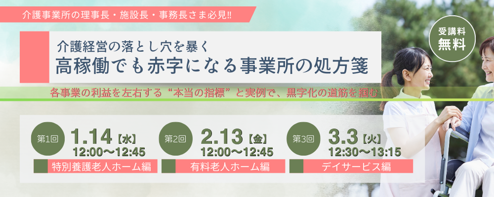 | 日時 | 第1回:2026年01月14日(水)12:00~12:45 特別養護老人ホーム編 第2回:2026年02月13日(金)12:00~12:45 有料老人ホーム編 第3回:2026年03月03日(火)12:30~13:15 デイサービス編 |