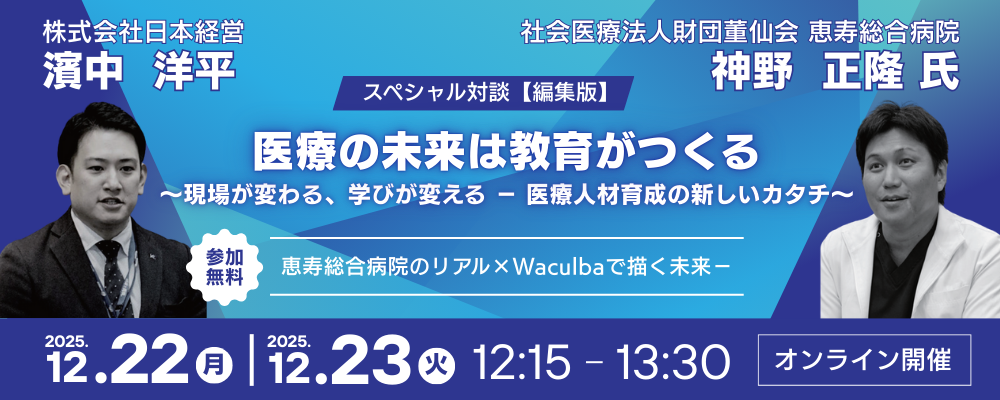 本セミナーは、第一線でご活躍されている恵寿総合病院 理事長補佐 神野正隆様と、Waculba創設者の濱中によるスペシャル対談の形式で、より深い視点から医療教育に対するお二人のお考えを掘り下げてご紹介します。