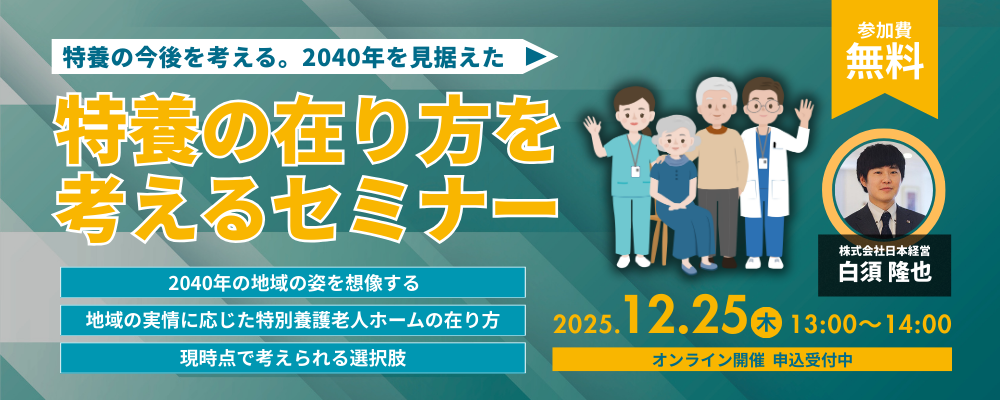厚生労働省では「人口減少・サービス需要の変化に応じたサービス提供体制の構築等」に関する検討が進み、地域単位での機能分化やサービス再編が求められつつあります。本セミナーでは、こうした政策動向を踏まえ、今後の特養経営に求められる方向性を具体的な地域のデータを基にお伝えします。