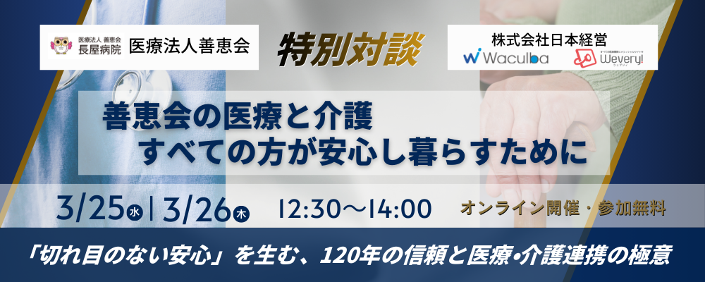 | 内容 | 1. はじめに(善恵会様のご紹介) 2. 医療と介護の包括サービスによる安心感と対応力 3. 地域密着・患者本位のケアを支える組織文化と現場での取り組み 4. 今後の地域医療・福祉への展望と課題 ※上記の内容は予告なく変更する場合がありますのでご了承ください。 |