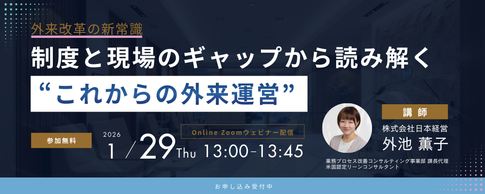 本セミナーでは、外来運営を“人の問題”ではなく“構造・流れの設計”として捉え直し、外来をより動きやすい状態へ整えていくための視点を、制度 × 現場 × 医療構造の三つの切り口から解説します。