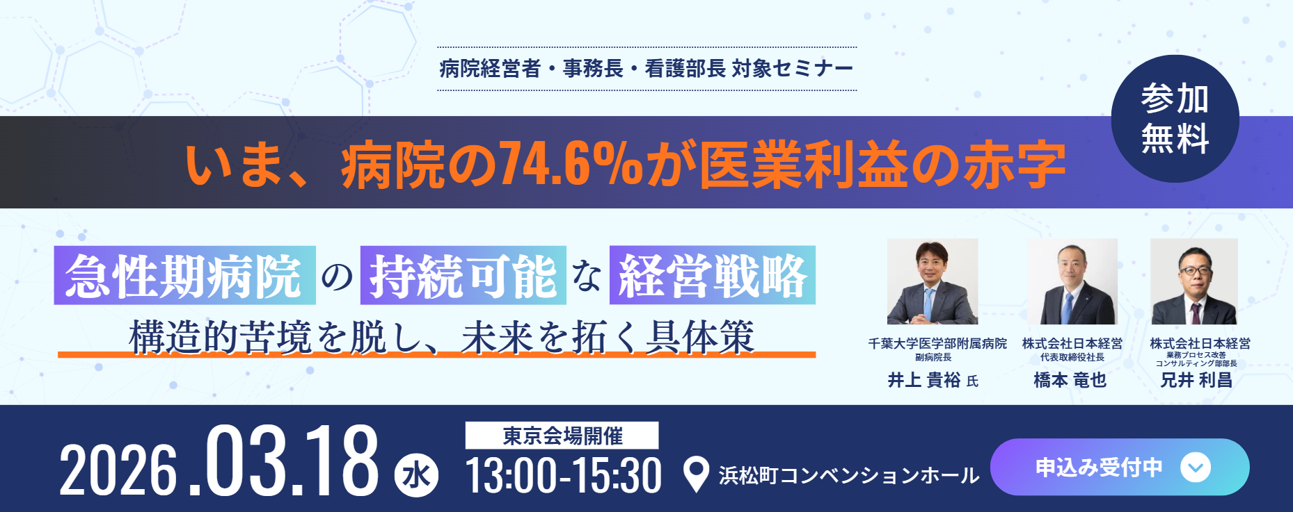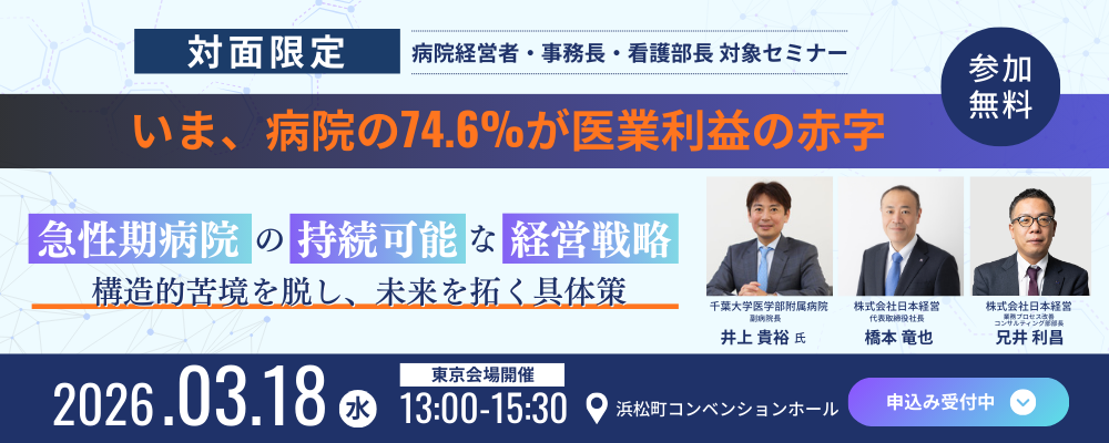 | 内容 | 基調講演:講師 井上貴裕氏 「急性期病院が直面する課題と持続可能な経営への視点」 2026年度診療報酬改定の方向性を踏まえ、経営層が理解すべき急性期機能維持のための具体的論点、そして今後の経営戦略の要諦を解説します。 講演2:講師 橋本竜也 「経営戦略としての業務プロセス改善」 4つの経営機能(トップ方針/戦略・計画/役割・権限/実行プロセス)の連動という視点から、業務プロセス改善を単なる効率化ではなく、病院経営を動かす実践的な手段として位置づけ、その重要性をお伝えします。 講演3:講師 兄井利昌 「急性期病院における看護部改革は経営戦略」 急性期病院の看護部改革で実際に成果を上げてきたコンサルティング事例をもとに、現場で再現可能な手法と考え方を整理してお伝えします。 |