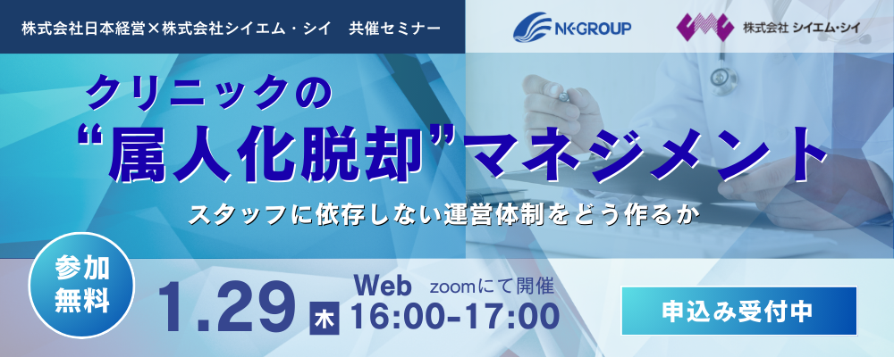| 内容 | ①オープニング・導入 ※司会(株式会社日本経営) 共催の目的紹介:「クリニック業界に知見がある、経営課題を把握している」 日本経営と、「現場の属人化解消を多く支援してきた」シイエム・シイのコラボ →クリニック業界における課題解決のヒントを提供。 ②経営視点から見る属人化のリスクと課題 ※株式会社日本経営 ・医療業界の環境変化(人材難・改定・採用コスト上昇) ・属人化がもたらす経営リスク(財務・人材・患者対応・セキュリティ・法令違反) ・加速する医療業界のDX化対応 ③属人化脱却のステップ ※シイエム・シイ ・活動計画の立て方、体制づくり ・業務棚卸しの方法 ④実践事例:属人化脱却を実現したクリニックのケース紹介 ※株式会社日本経営 ・POS導入の事例 ⑤まとめ:サービス紹介、問い合わせ先、アンケートご案内、QA" |
