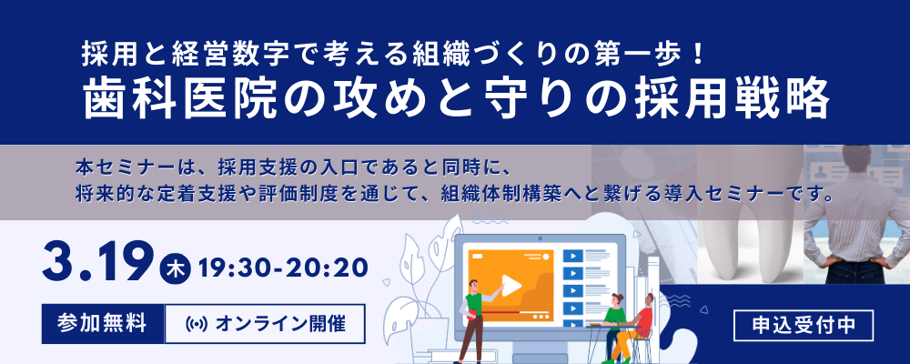 | 内容 | ・歯科業界における採用環境の変化 ・歯科医院に求められる採用の考え方と基本的な進め方 ・経営数字から考える適正な人員数 ・採用後を見据えた定着と労務管理 ・採用を起点とした組織づくりの方向性 |