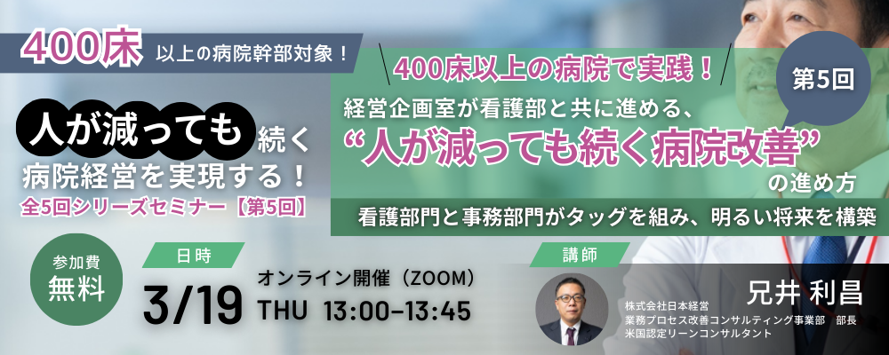 | 内容 | 1. 看護現場の状況とこれから求められる看護部の進化 (1)管理職が推測する離職理由と、実際の離職理由のギャップ (2)5年目以下が退職する看護部の5つの特徴 (3)改善活動のない職場で発生する離職文化 (4)「改善したくても人が不足で改善できません」問題をどのように考えるか 2.病棟業務改善で師長育成とタスクシフトを成功させるポイント (1)看護部の成果は病院経営に強いインパクトを与える。 (2)スーパー師長が活躍できる病棟から、師長全員が活躍できる病棟へ (3)患者視点で安心・安全を高めるための改善を行う。 (4)他職種を巻き込んだ看護部タスクシフトを含めた改善活動のポイント 3.看護部を支える経営企画室/事務部門のありかた (1)「看護部が求める経営企画室/事務部門」と「経営企画室/事務部門が求める看護部」のギャップ (2)看護部を支えるために経営企画室/事務部門はどのような取組みが必要か |