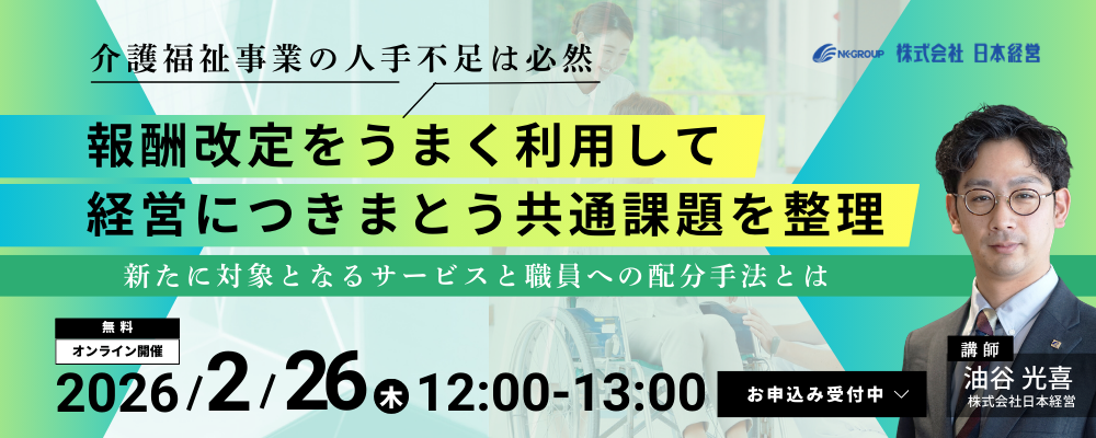 「この先も人材が確保できるのか」多くの経営者がこの不安と戦っておられるのではないでしょうか。本セミナーでは人手不足時代に乗り切る必要がある4大課題―人材獲得・定着・育成・生産性向上―を解決する具体策を提示します。さらに、効率化やマネジメント改善に取り組んだ上でもなお残る“ヒト”にまつわる課題を組織体制構築を用いてどう乗り越えるか、実例を交えて解説。参加後には、自法人のリスクを俯瞰し、必要な施策を体系的に描ける状態を目指します。変化の激しい制度環境でも持続的に人材を確保する正攻法を、本セミナーでお伝えします。