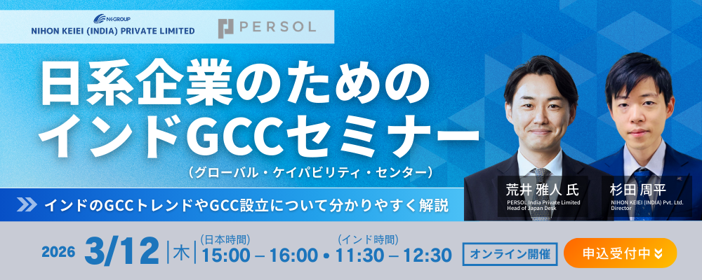| 内容 | ・GCCとは何か ・インドにGCCが集積する理由 ・人材の採用と活用 ・GCC設立のプロセス ・設立後の注意点まとめ |