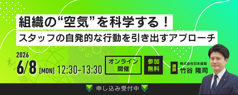 本セミナーでは、抽象的な「組織の空気」を科学的に分析し、スタッフの行動原理を「自発型」へと書き換える具体的なアプローチを公開します。心理的安全性がもたらす生産性向上のメカニズムから、個人の「主体性」を組織の「成果」へとつなげる仕組みづくりまでを徹底解説。