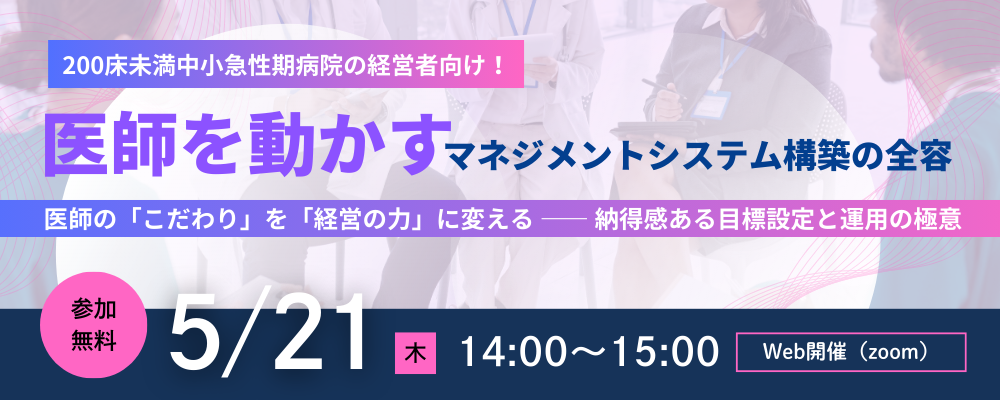 本セミナーでは、急性期医師特有の「症例へのこだわり」と「経営数字」の衝突を解き明かし、医師の行動変容を促す「マネジメントシステム」の構築法を解説します。医師に『管理』を感じさせず、自ら組織の目標へ向かわせる目標設定の型と、効果的な運用法を伝授します。