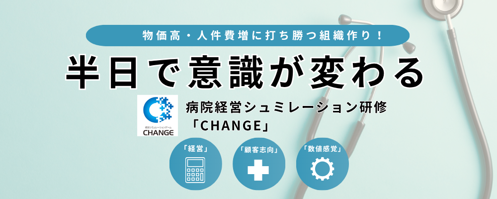 | 内容 | ■<準備編>病院経営入門 ・病院経営の仕組み(売上と費用) ・病院の財務諸表の見方 ■<実践編>病院経営シミュレーションゲーム ・CHANGE実施 ①4~6人のグループに分かれて経営者と経営幹部を決定 ②年間計画策定会議を実施して決算報告書を基に今期の施策を選択 ③外部環境の変化や突発的なハプニングに対応するため再度施策を選び直す ④最終的に自己資本が最大となったグループが勝利、経営破綻したグループは謝罪会見を実施 ・リフレクション(教訓の言語化/「私の行動宣言」作成) ※ ゲームでは、他法人の参加者と合同のグループワーク形式で行います。他院のリーダー層とのディスカッションや情報交換の機会としても活用いただけます。 |