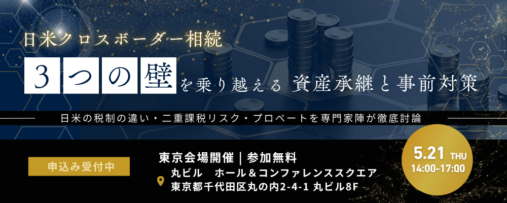 | 内容 | 【プログラム内容】 日米にまたがる相続には、国内だけの相続とは全く異なる「3つの大きな壁」が存在します。本プログラムでは、その全容と具体的な対策を、日米の各専門家が分かりやすく徹底解説いたします。 第1部【米国の遺産税】 日米クロスボーダー相続における米国遺産税と二重課税 米国特有の税制度により、思わぬ落とし穴にはまるケースが後を絶ちません。 ・基礎控除半減のインパクト:今後の税制改正が与える影響 ・非居住者の税務リスク:日本在住でも安心できない理由 第2部【日本の相続税】 米国資産を持つ方が知るべき全容と二重課税を防ぐ仕組み 両国で課税される事態を防ぐための必須知識です。 ・申告対象となる米国資産:日本の相続税の対象範囲とは ・外国税額控除:日米間で二重課税を回避・調整する制度の適用における留意点 第3部【米国プロベート(検認手続き)】 日本の遺言書では防げない!プロベートの恐怖と回避策 現地で資産が数年単位で凍結されるリスクと対策をお伝えします。 ・プロベートとは何か:莫大な時間とコストがかかる理由 ・生前対策の鉄則:ジョイント・テナンシーやリビング・トラスト等の回避策 第4部【特別ディスカッション】 専門家陣による徹底検証!3つのケーススタディ よくある事例をもとに、各分野の専門家が実践的な「最適解」を提示します。 ・ケース①:ハワイなど米国内に不動産を所有している ・ケース②:過去に開設した米国の銀行・証券口座を放置している ・ケース③:子どもがすでに米国へ移住している、または移住予定である ※セミナーのテーマは予定なく変更することがございます。あらかじめご了承くださいますようお願い申し上げます。 |
