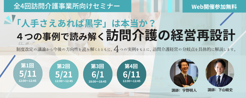 本セミナーでは、制度改定の議論から今後の方向性を読み解くとともに、4つの実例をもとに、訪問介護経営の分岐点を具体的に解説します。