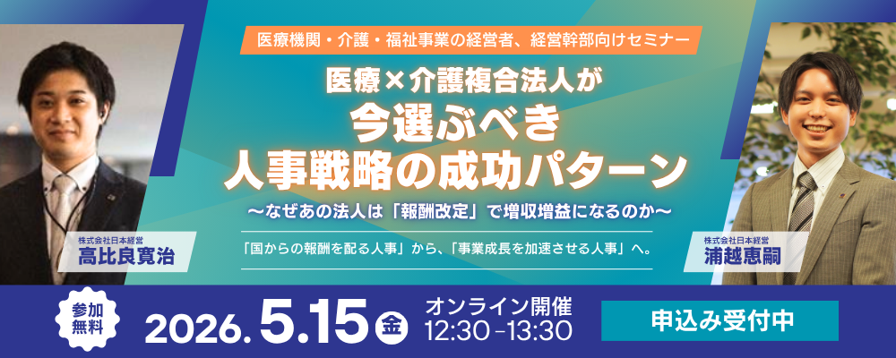 | 内容 | 1.業界のトレンドと診療、介護報酬改定の論点 2.失敗する人事戦略の共通点 3.高度化する人事戦略事例 4.法人の現状の適正把握手法 |