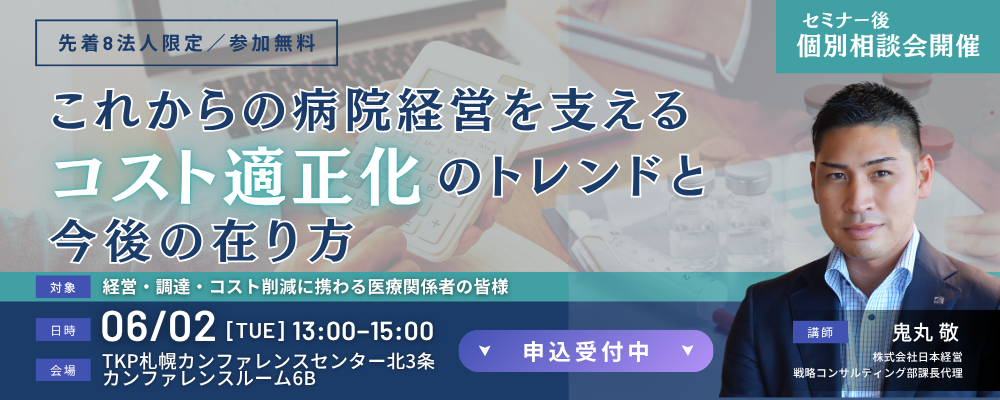 | 内容 | ●PART 1|講師/個別相談対応社員紹介 コスト適正化の専任プロ集団が実績をご紹介 講師:鬼丸敬/個別相談:辰井雄、木津郷、渡邉康晃 ●PART 2|昔ながらの商慣行と、現在の変化への向き合い方 医薬品・診療材料・医療機器・委託業務各種 ●PART 3|チーム医療のひとつ「コスト適正化」 経営陣・医療従事者・事務部門から取引先まで、コスト適正化のカギは「全員関与」の概念 |