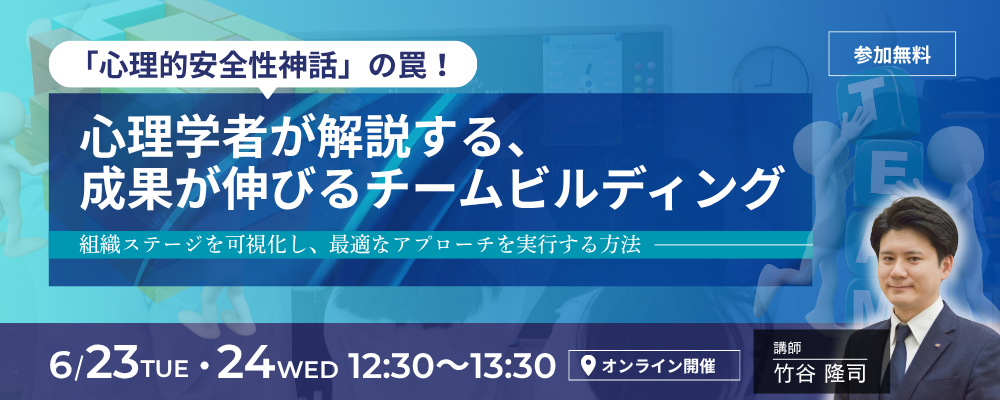 | 内容 | ・部下の顔色をうかがうマネジメント ・心理的安全性の”さらに一歩先” ・真の心理的安全性という矛盾 ・心理的安全性が薬になるフェーズ、毒になるフェーズ ・トップダウンや競争(切磋琢磨)が最優先されるべき時期のマネジメント ・あなたのチームは今どこに? ・正しい組織課題の特定法 ・次の一手の見極め方 ・成果が伸びるチームを作る具体策 |