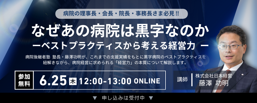 | 内容 | 1.なぜ病院経営において収支の差が生まれるのか 2.黒字病院のベストプラクティス分析 3.経営者に求められる「経営力」とは何か 4.経営力をいかに育てるか |